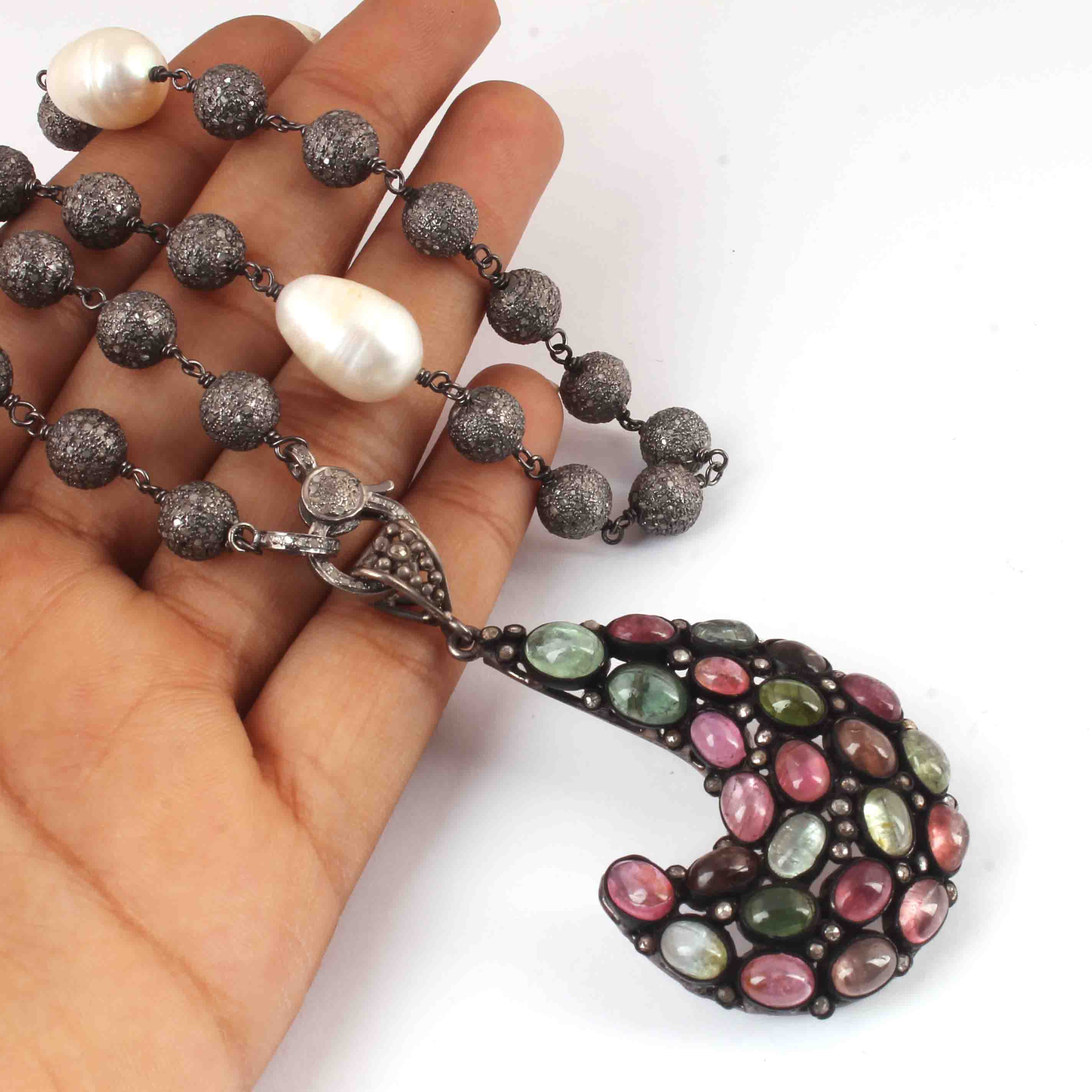 Pave Diamond balls with Pearl Beaded Necklace - Necklace With Lobster - Long Knotted Beads Necklace - Diamond balls Necklace (Without Pendant) BN046